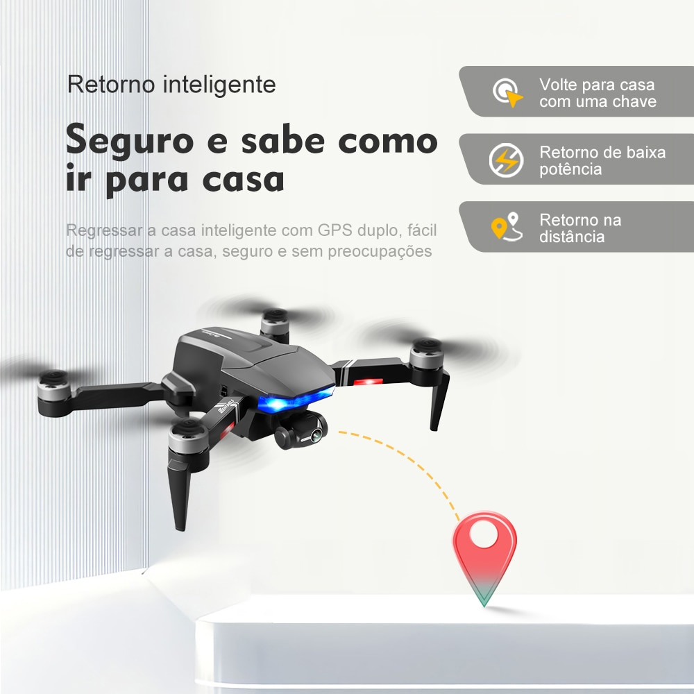 Tenha um voo seguro e mais tranquilo sabendo que seu drone dispõe de um GPS potente com os exclusivos sistemas de retorno automático por comando, ou retorno por bateria fraca, e ainda retorno por distância.